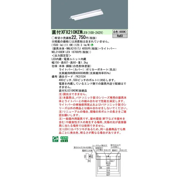 パナソニック iDシリーズ 天井直付型 20形 一体型LEDベースライト 反射笠付 XFX210KEWLE9 白色(4000K)