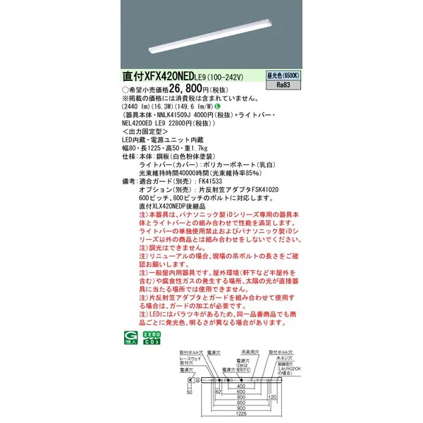 パナソニック iDシリーズ 天井直付型 40形 一体型LEDベースライト iスタイル W80 XFX420NEDLE9 昼光色(6500K)