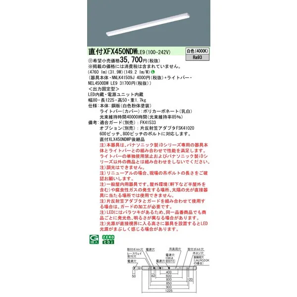 パナソニック iDシリーズ 天井直付型 40形 一体型LEDベースライト iスタイル W80 XFX450NDWLE9 白色(4000K)