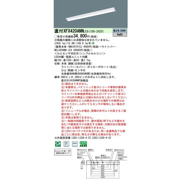 パナソニック iDシリーズ 天井直付型 40形 一体型LEDベースライト Dスタイル W150 富士型 XFX420ANNLE9 昼白色(5000K)