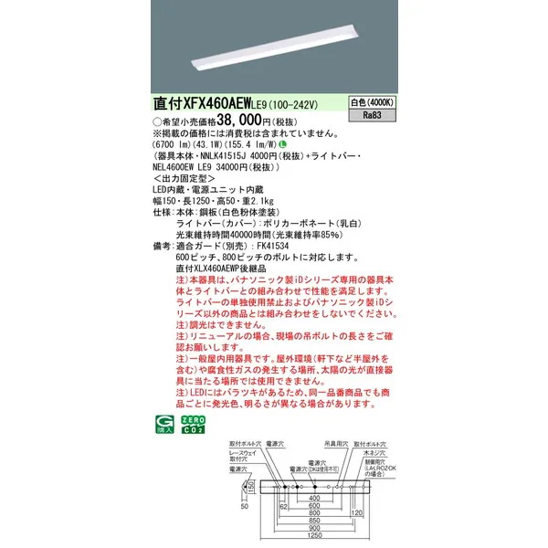 パナソニック iDシリーズ 天井直付型 40形 一体型LEDベースライト Dスタイル W150 富士型 XFX460AEWLE9 白色(4000K)
