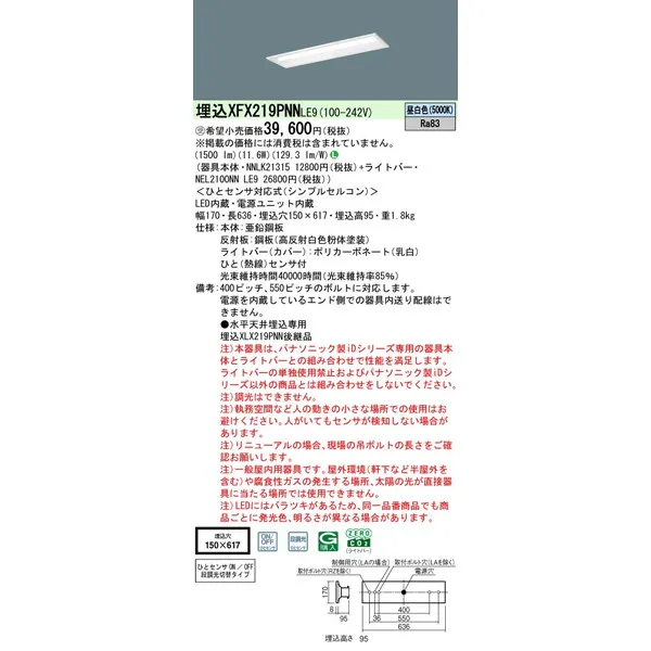 パナソニック iDシリーズ 天井埋込型 20形 一体型LEDベースライト リニューアル 下面開放型 W150 XFX219PNNLE9 昼白色(5000K)
