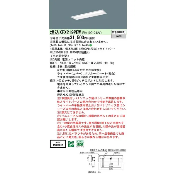 パナソニック iDシリーズ 天井埋込型 20形 一体型LEDベースライト リニューアル 下面開放型 W150 XFX219PEWLE9 白色(4000K)