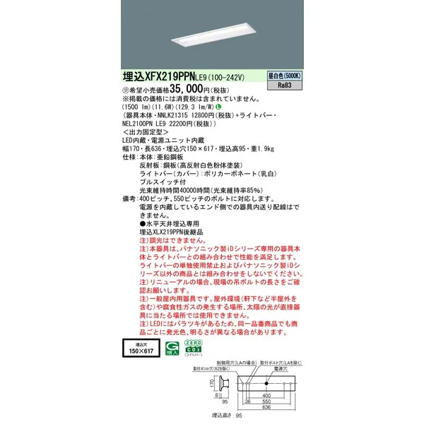 パナソニック iDシリーズ 天井埋込型 20形 一体型LEDベースライト リニューアル 下面開放型 W150 XFX219PPNLE9 昼白色(5000K)
