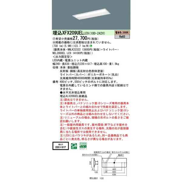パナソニック iDシリーズ 天井埋込型 20形 一体型LEDベースライト リニューアル 下面開放型 W220 XFX209UELLE9 電球色(3000K)