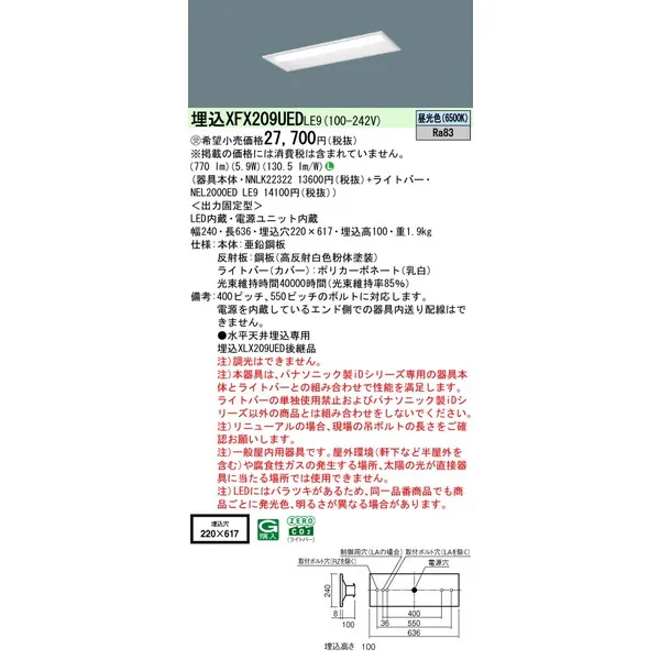 パナソニック iDシリーズ 天井埋込型 20形 一体型LEDベースライト リニューアル 下面開放型 W220 XFX209UEDLE9 昼光色(6500K)