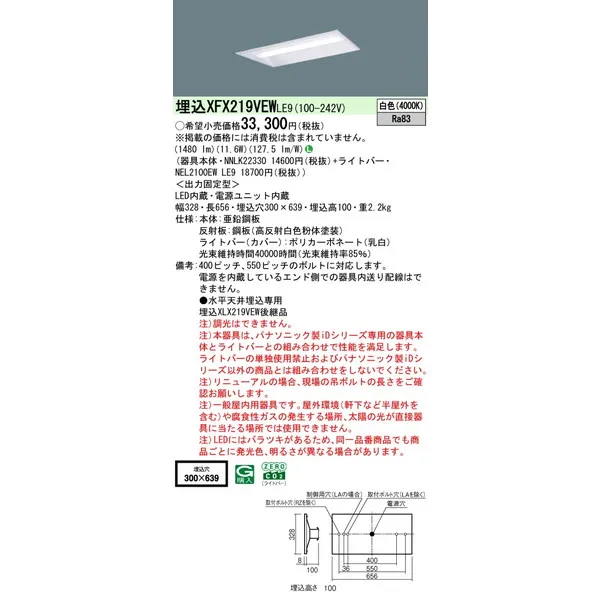 パナソニック iDシリーズ 天井埋込型 20形 一体型LEDベースライト リニューアル 下面開放型 W330 XFX219VEWLE9 白色(4000K)