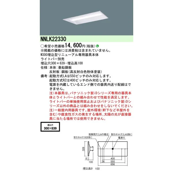 パナソニック iDシリーズ 天井埋込型 20形 一体型LEDベースライト リニューアル 下面開放型 W330 NNLK22330+NEL2300DWLE9 白色(4000K)