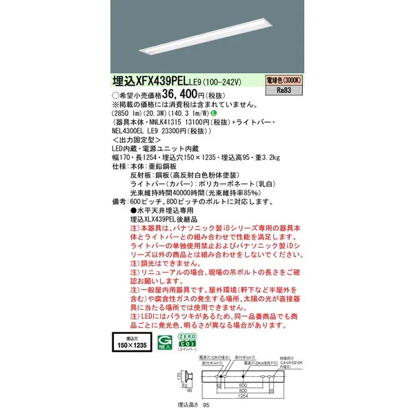 パナソニック iDシリーズ 天井埋込型 40形 一体型LEDベースライト リニューアル 下面開放型 W150 XFX439PELLE9 電球色(3000K)