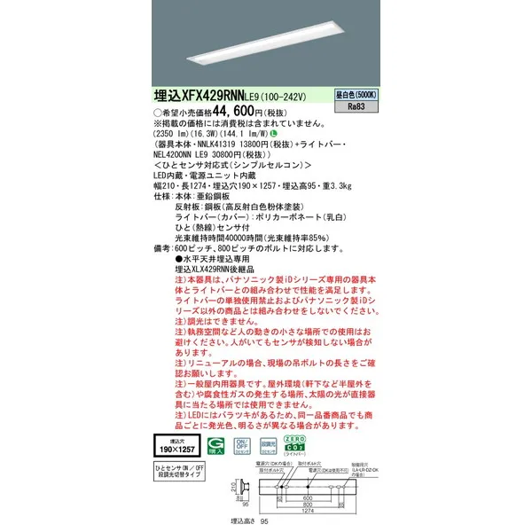 パナソニック iDシリーズ 天井埋込型 40形 一体型LEDベースライト リニューアル 下面開放型 W190 XFX429RNNLE9 昼白色(5000K)