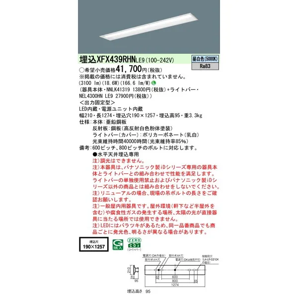 パナソニック iDシリーズ 天井埋込型 40形 一体型LEDベースライト リニューアル 下面開放型 W190 XFX439RHNLE9 昼白色(5000K)