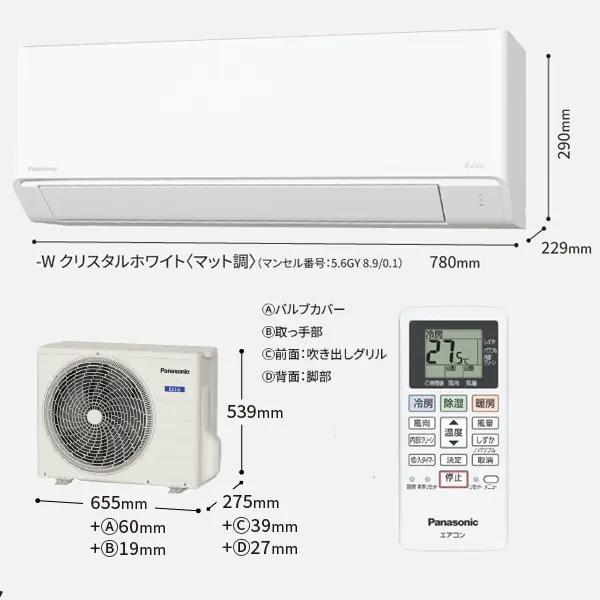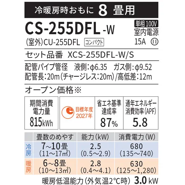 室内機品番 CS-255DFL 室外機品番 CU-255DFL 室内機寸法 H290×W780×D229mm 室内機重量 8kg 室外機寸法 H539mm