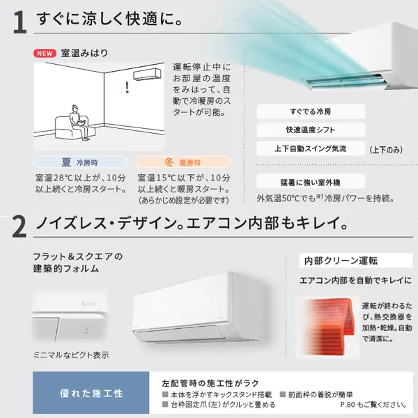 ※1:メーカー測定基準による。CS-405DHX2、当社環境試験室(約14畳)、外気温50℃、設定温度25℃で冷房運転。室温が25℃となり、連続運転動作することを確認。外気温とは室外機の吸い込み温度です。使用環境・設置状況により能力の低下があります。所定の設置スペースを確保してください。