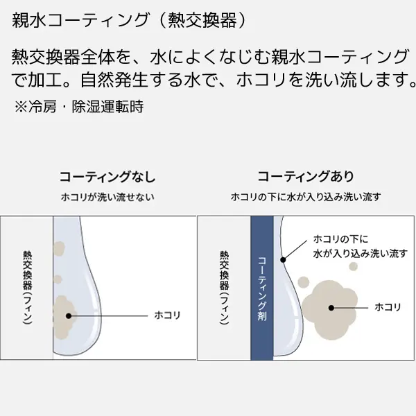 熱交換器全体を、水によくなじむ親水コーティングで加工。 自然発生する水で、ホコリを洗い流します。(冷房・除湿運転時)