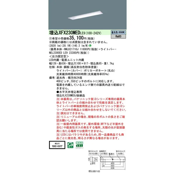パナソニック iDシリーズ 天井埋込型 20形 一体型LEDベースライト 下面開放型 W100 XFX230MEDLE9 昼光色(6500K)