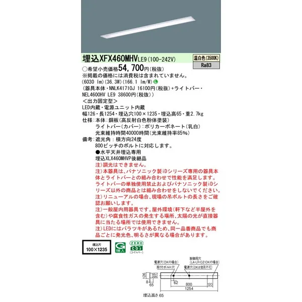 パナソニック iDシリーズ 天井埋込型 40形 一体型LEDベースライト 下面開放型 W100 XFX460MHVLE9 温白色(3500K)