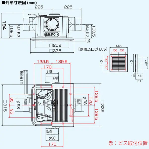 副吸込グリル3方向選択可能