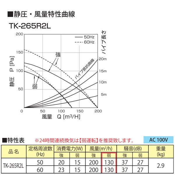 風量(m3/h) 200/200・130/130 強(50/60Hz)・弱(50/60Hz)
