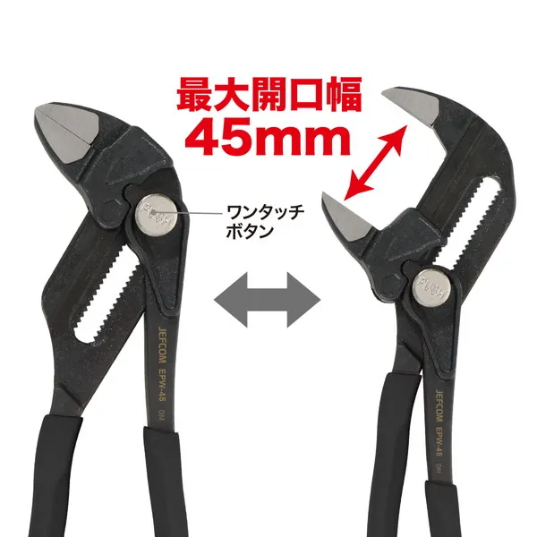 最大開口幅45mm ナット回しが簡単 ●ラチェット機構で開口部の微調整が簡単 ●ワンタッチボタンでスライド調整 爪が平行移動するので調整がしやすい ●最大開口幅:45mm