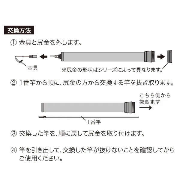 4.竿を引き出して、交換した竿が抜けないことを確認してからご使用ください。