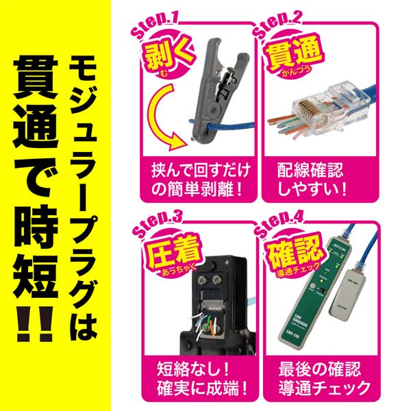 - 成端作業が早い!貫通型モジュラープラグ対応のツールセット
