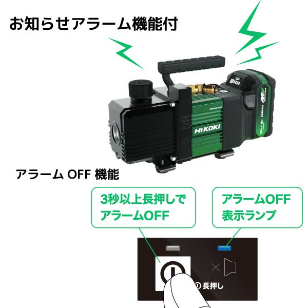 電源スイッチを3秒以上長押しすると、アラームをOFFにできます。再度電源スイッチを3秒以上長押しすると、解除されます。表示ランプが点灯していると、アラームOFF機能が働いている状態です。