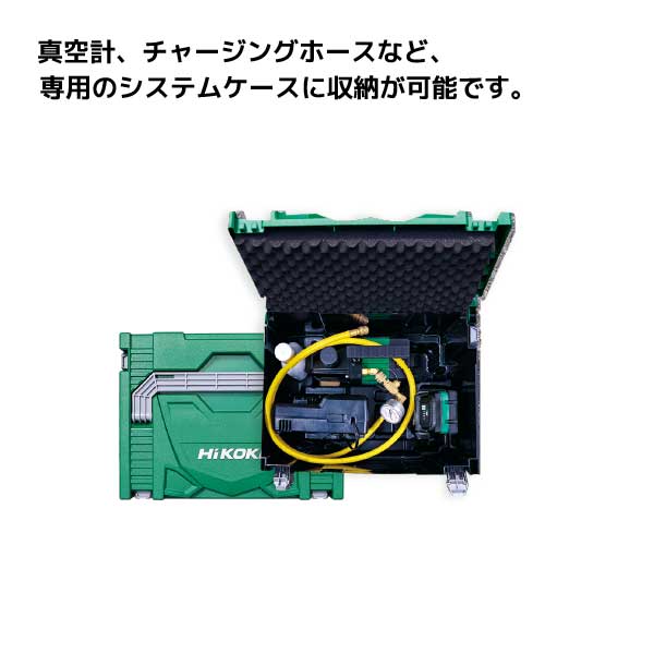 真空計、チャージングホースなど、専用のシステムケースに収納が可能です。そのまま収納できることで、準備と片付けの時間と手間を大幅に削減できます。