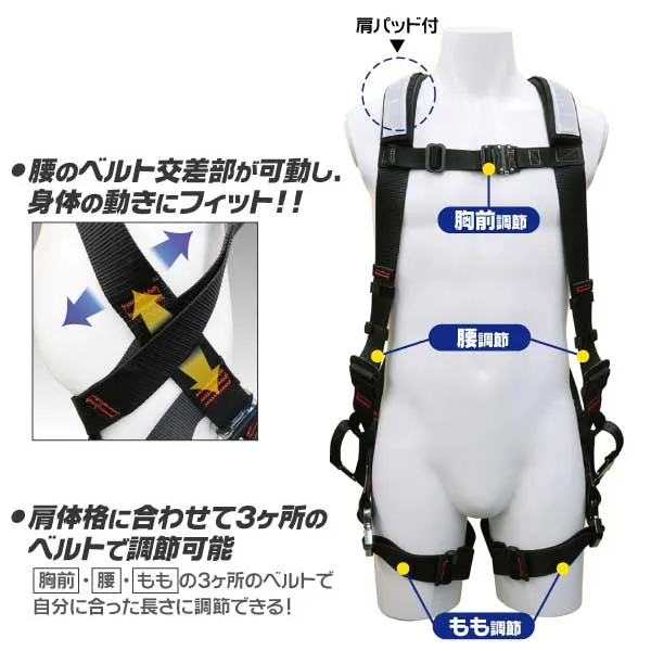 ●胸前・腰・もも、3ヶ所のベルトで調節可能!